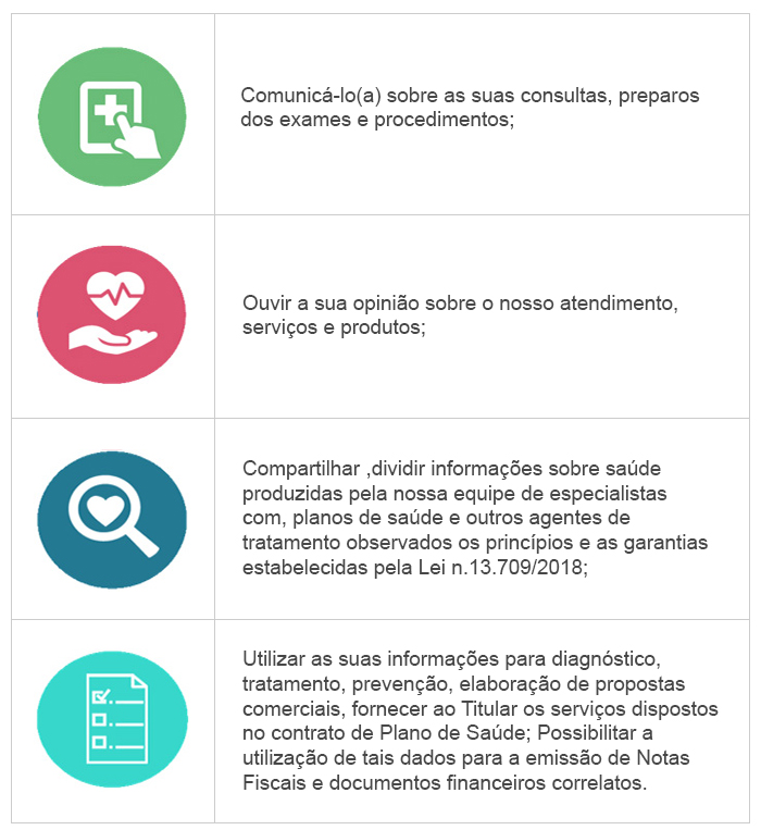 Por conta da nova Lei Geral de Proteção de Dados (Lei 13.709/2018) ou LGPD, que tem como objetivo reforçar a responsabilidade e a transparência no tratamento dos seus dados pessoais (nome completo, endereço, localização, histórico de navegação na internet, etc.), assim como os seus dados de saúde (dados sensíveis), e também no desempenho do nosso papel, gostaríamos de pedir o seu consentimento para armazená-los e utilizá-los (os seus dados) com toda segurança e privacidade.