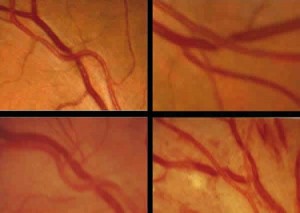 Seguem imagens de algumas alterações nos vasos da retina causados pela Hipertensão Arterial: